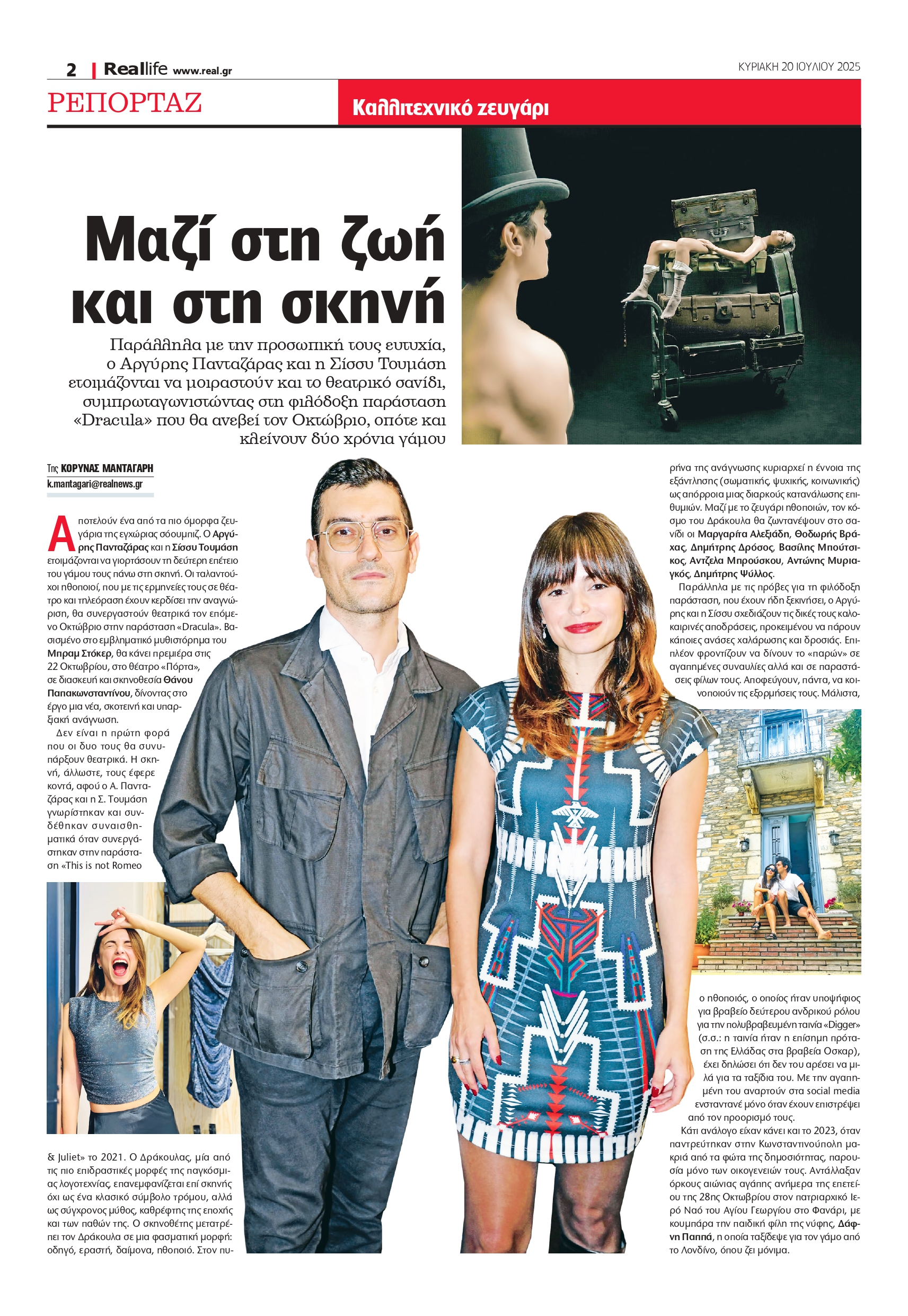 Αποτελούν ένα από τα πιο όμορφα ζευγάρια της εγχώριας σόουμπιζ. Ο Αργύρης Πανταζάρας και η Σίσσυ Τουμάση ετοιμάζονται να γιορτάσουν τη δεύτερη επέτειο του γάμου τους πάνω στη σκηνή. Οι ταλαντούχοι ηθοποιοί, που με τις ερμηνείες τους σε θέατρο και τηλεόραση έχουν κερδίσει την αναγνώριση, θα συνεργαστούν θεατρικά τον επόμενο Οκτώβριο στην παράσταση «Dracula».