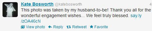Η 29χρονη ηθοποιός Kate Bosworth ανακοίνωσε στους fans της μέσω του λογαριασμού της στο Twitter πως ναι, αρραβωνιάστηκε τον αγαπημένο της (και σκηνοθέτη) Michael Polish. Και όχι μόνο… Τους έδειξε και το περίφημο δαχτυλίδι!…