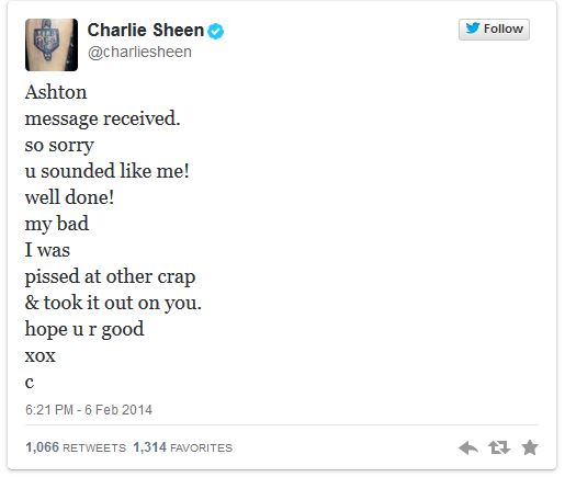 «Έλαβα το μήνυμά σου Ashton. Πραγματικά Συγνώμη. Ακουγόσουν σαν εμένα! Μπράβο! Δικό μου το λάθος. Ήμουνα εκνευρισμένος με άλλα πράγματα και ξέσπασα σε’ σένα. Ελπίζω να είσαι καλά.Αλλά μια καινούργια σκέψη. Μάγκα, την επόμενη φορά που θα μου πεις να σκάσω, θα σε βάλω σε κλινική για δίαιτα για έναν χρόνο #Το έπιασες μικρέ;».