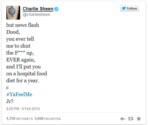 Από την πρώτη μέρα ο Τσάρλι Σιν μιλούσε άσχημα για τις υποκριτικές του ικανότητες και δεν είχε σταματήσει μέχρι που πριν δύο μέρες ο Άστον Κούτσερ από τηλεοπτική εκπομπή του ζήτησε να βγάλει το σκασμό. Φυσικά δεν άφησε αναπάντητη την πρόκληση.