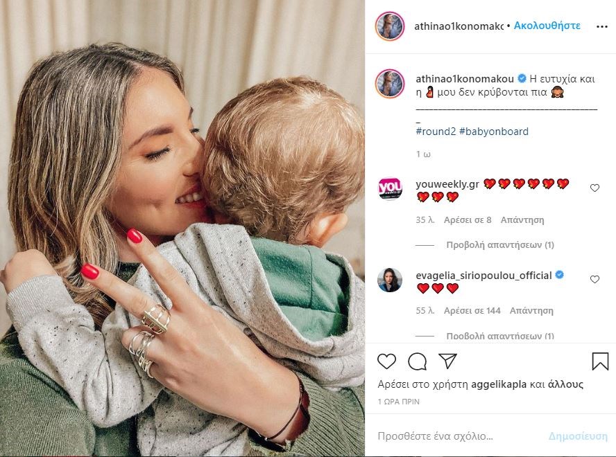 Κρατώντας τον γιο της αγκαλιά η Αθηνά Οικονομάκου χαμογελά ευτυχισμένη νιώθοντας ότι όλα της τα όνειρα πραγματοποιούνται. Με μία τέτοια φωτογραφία η ηθοποιός θέλησε να γνωστοποιήσει στους ακολούθους της ότι είναι έγκυος και περιμένει το δεύτερο παιδί της.