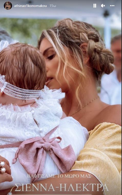 Η νεοφώτιστη πήρε το όνομα Σιέννα – Ηλέκτρα και νονοί έγιναν οι καλοί φίλοι του ζευγαριού Κωνσταντίνα Βασιλείου, Πέτρος Ανδριόπουλος, Μιχάλης Νέζης και Δώρα Τσακανίκα.