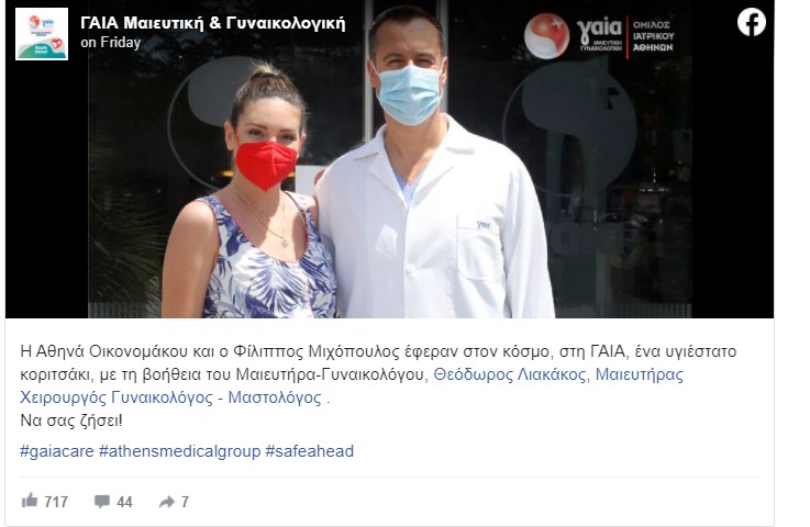 Την ευχάριστη είδηση έκανε γνωστή η κλινική στην οποία γέννησε η Αθηνά Οικονομάκου, με ανάρτηση στο Facebook. «Η Aθηνά Οικονομάκου και ο Φίλιππος Μιχόπουλος έφεραν στον κόσμο, στη ΓΑΙΑ, ένα υγιέστατο κοριτσάκι, με τη βοήθεια του Μαιευτήρα-Γυναικολόγου, Θεόδωρος Λιακάκος, Μαιευτήρας Χειρουργός Γυναικολόγος – Μαστολόγος», ανέφερε η ανακοίνωση.