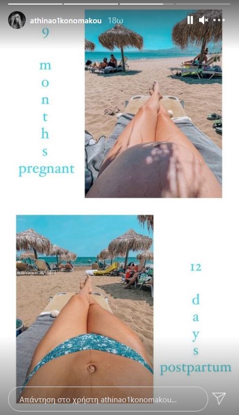 Μόλις λίγες ημέρες μετά τη γέννηση της κόρης της, η Αθηνά Οικονομάκου απόλαυσε στιγμές χαλάρωσης στην παραλία. Η ηθοποιός έκανε γνωστό μέσα από τον λογαριασμό της στο Instagram πως ανήμερα του Αγίου Πνεύματος βρέθηκε στη θάλασσα και δεν δίστασε να δημοσιεύσει ολόσωμες φωτογραφίες με μαγιό, αλλά και να δείξει πώς είναι η κοιλιά της λίγες ημέρες μετά τον τοκετό.