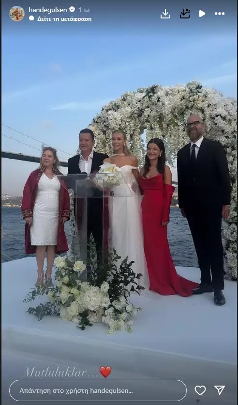 Σε αυτή, το ζευγάρι ποζάρει χαμογελαστό, ενώ στέκεται μπροστά στη θάλασσα, με φόντο έναν εντυπωσιακό στολισμό με λευκά λουλούδια. Πάνω στο στιγμιότυπο έγραψε στα τουρκικά: «Ευτυχία». Το ζευγάρι μέχρι στιγμής, δεν έχει κάνει κάποια ανάρτηση από το ευτυχές συμβάν, κρατώντας έτσι την προσωπική του ζωή μακριά από τα φώτα της δημοσιότητας.