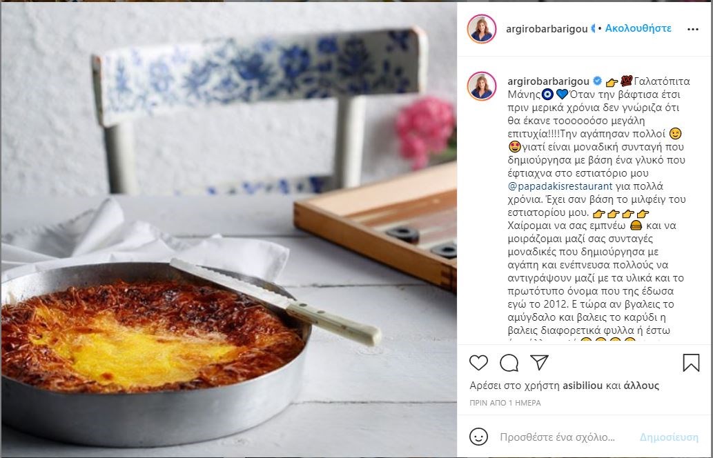 Ωστόσο, η Αργυρώ Μπαρμπαρίγου με ανάρτησή της στο instagram υπενθυμίζει ποιος είναι ο “νονός της συνταγής” και εκφράζει τη χαρά της που εμπνέει και πολλούς να αντιγράψουν μαζί με τα υλικά και το πρωτότυπο όνομα που της έδωσε εκείνη το 2012.