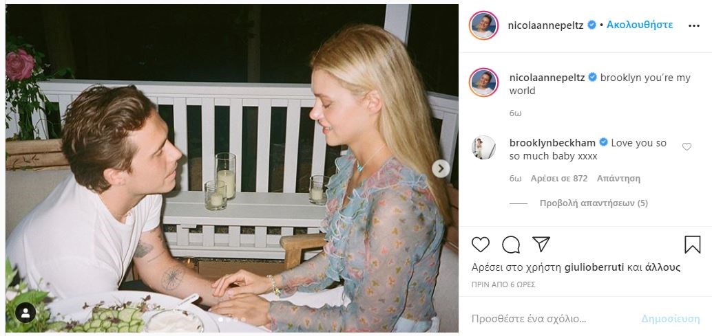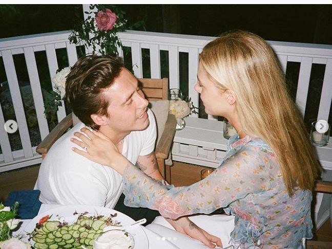 Η Νίκολα Πελτζ μοιράστηκε τον Ιούλιο του 2020 με διαδικτυακούς της φίλους τη στιγμή που ο αγαπημένος της Μπρούκλιν Μπέκαμ γονάτισε μπροστά της κάνοντάς της πρόταση γάμου και προσφέροντάς της το διαμαντένιο δαχτυλίδι αξίας 350.000 λιρών. Κάποια στιγμιότυπα ανέβασε και ο ίδιος ο Μπρούκλιν.