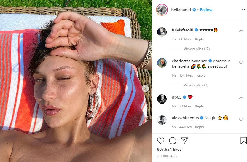 Έριξε για άλλη μια φορά το Instagram η Μπέλα Χαντίντ με τις φωτογραφίες που δημοσίευσε φορώντας ένα εντυπωσιακό αλλά μικροσκοπικό μπικίνι. Το μοντέλο απόλαυσε την ηλιοθεραπεία της κοντά στα αγαπημένα της άλογα. Η Μπέλα ετοιμάζεται να γίνει θεία, καθώς η αδελφή της Τζίτζι περιμένει το πρώτο της παιδί.