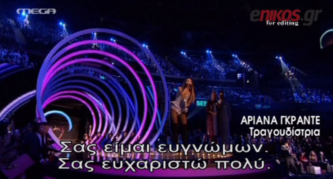 Στην 20η απονομή των βραβείων MTV που έγινε στη Γλασκώβη, μεγάλη νικήτρια της βραδιάς αναδείχθηκε η Αριάνα Γκράντε. Η 21 ετών τραγουδίστρια με ελληνικές ρίζες ερμήνευσε επί σκηνής δύο από τις μεγαλύτερες επιτυχίες της.