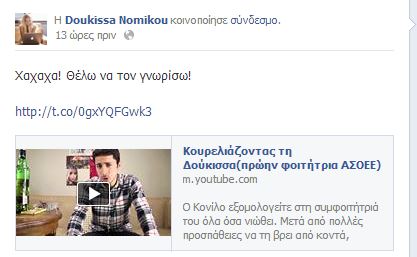 Η Δούκισσα Νομικού ανέβασε το βίντεο του φοιτητή της ΑΣΟΕΕ στον προσωπικό της λογαριασμό στο facebook σχολιάζοντας: “Θέλω να τον γνωρίσω!”.