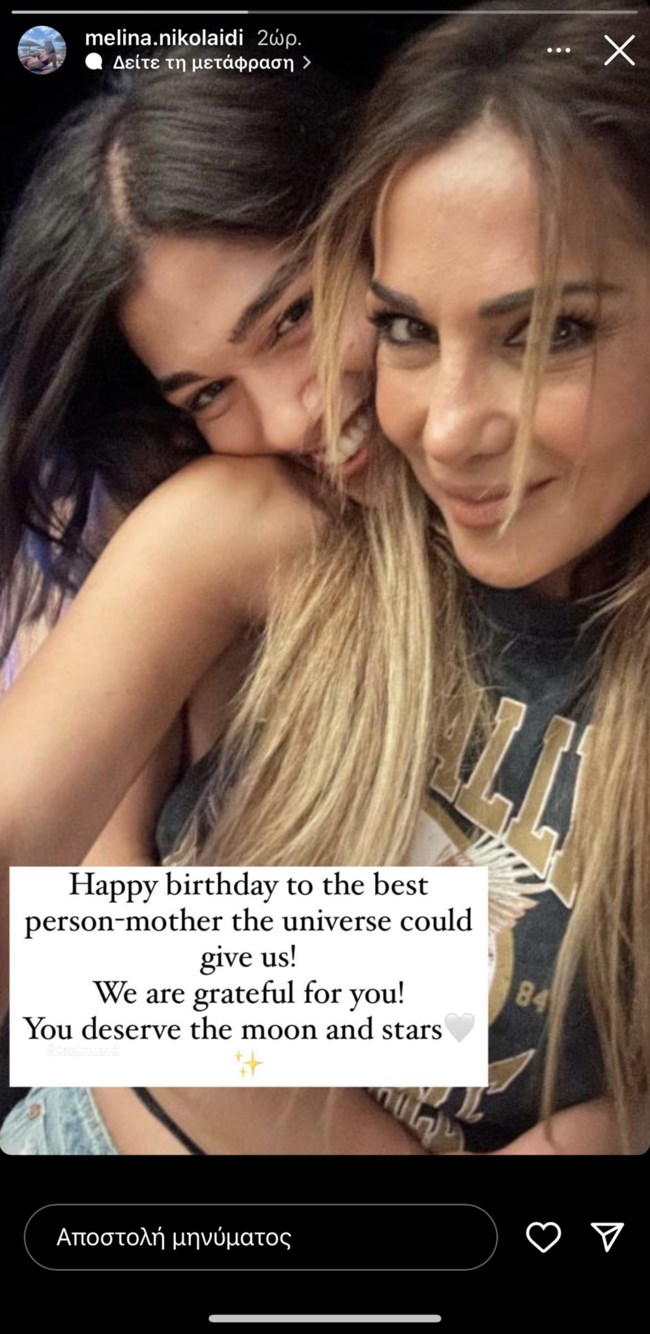 «Χρόνια πολλά στην καλύτερη μαμά, στον καλύτερο άνθρωπο που θα μπορούσε να μας δώσει το σύμπαν! Είμαστε ευγνώμονες! Σου αξίζουν το φεγγάρι και τα αστέρια» έγραψε η 19χρονη Μελίνα ανεβάζοντας μια τρυφερή κοινή τους φωτογραφία.