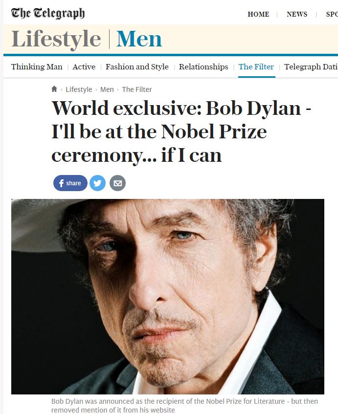 Ο Μπομπ Ντίλαν, ο οποίος είχε παραμείνει σιωπηλός μετά την ανακοίνωση στις 13 Οκτωβρίου της βράβευσής του με το Νόμπελ Λογοτεχνίας, ανακοίνωσε πως θα μεταβεί στη Στοκχόλμη για την απονομή του βραβείου και χαρακτήρισε τη βράβευσή του «καταπληκτική, απίθανη», σε συνέντευξή του που δημοσιεύεται στη βρετανική εφημερίδα Daily Telegraph.