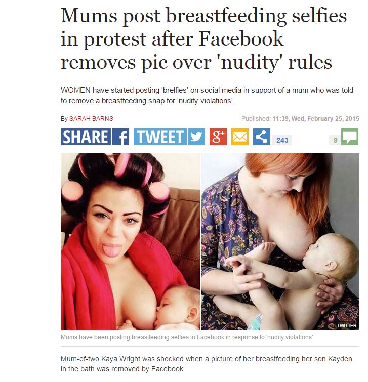 Πιο συγκεκριμένα, η Kaya Wright, μητέρα δύο παιδιών, ξαφνιάστηκε όταν μια φωτογραφία που απεικονίζει την ίδια να θηλάζει τον γιο της στο μπάνιο χαρακτηρίστηκε ως ακατάλληλη από το facebook και έτσι μοιράστηκε την ιστορία της με τις διαδικυτακές φίλες της.