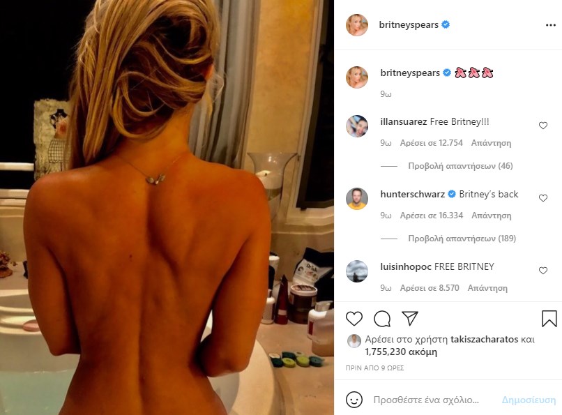 Η Μπρίτνεϊ Σπίαρς προσέφερε στους θαυμαστές της ένα προκλητικό στιγμιότυπο μέσα από το μπάνιο του σπιτιού της. Η τραγουδίστρια, που δίνει το τελευταίο διάστημα δύσκολες μάχες στο δικαστήριο, που αφορούν στη νομική επιμέλεια της κηδεμονίας της από τον πατέρα της, δημοσίευσε μια γυμνή φωτογραφία. Στη λεζάντα επέλεξε να χρησιμοποιήσει μόνο τρία emoji. Η 39χρονη είχε μαζέψει τα μαλλιά της, ώστε να φαίνεται η πλάτη της.