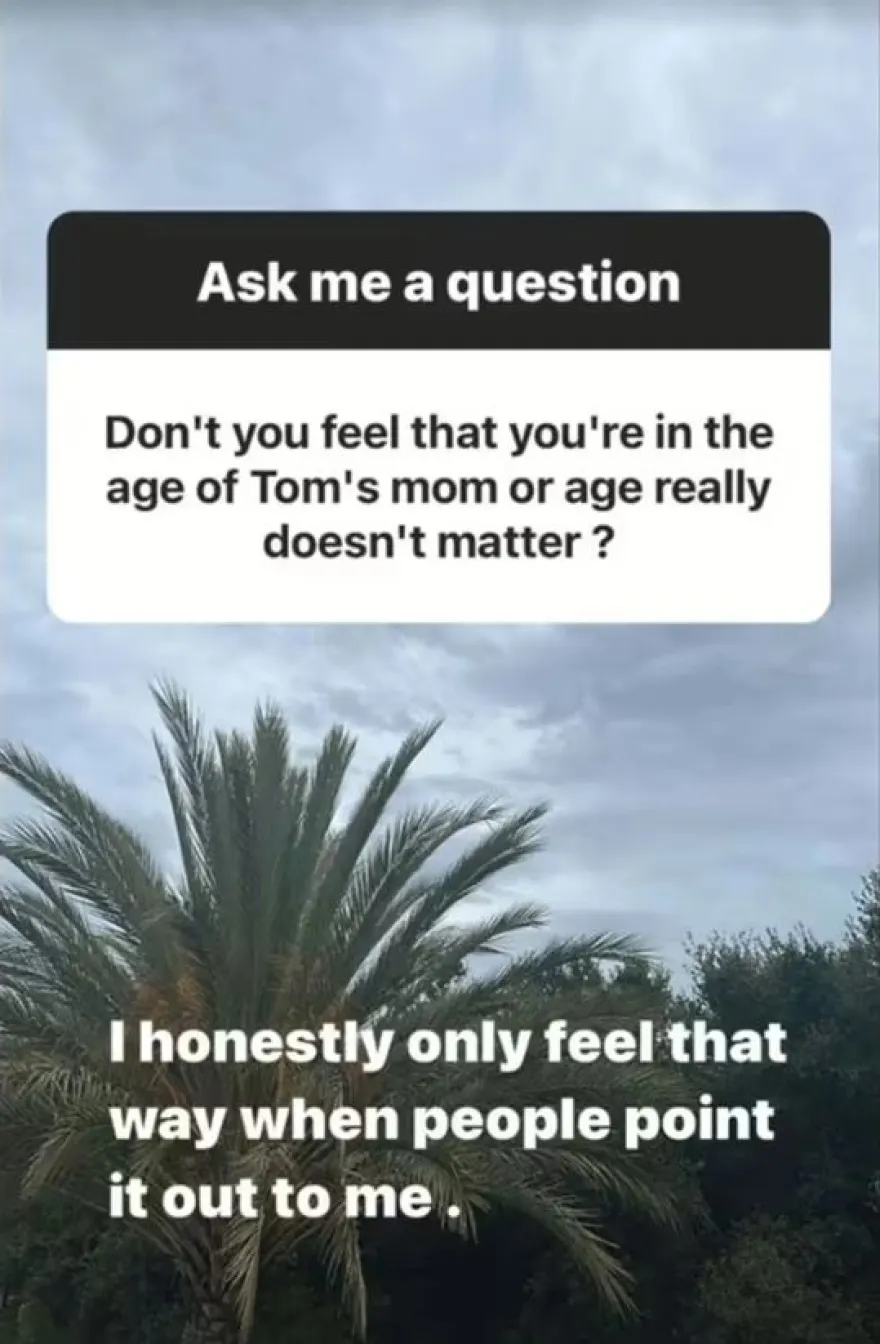 Μία από τις ερωτήσεις είχε να κάνει με τη διαφορά ηλικίας που έχει η Κλουμ με τον σύζυγό της. Συγκεκριμένα ακόλουθός της, της έγραψε: «Δεν νιώθεις ότι είσαι στην ηλικία της μαμάς του Τομ ή η ηλικία δεν έχει σημασία;».