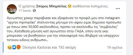 “Άγνωστος χάκερ παραβίασε και εξαφάνισε το προφίλ μου στο instagram “spyros mpimpilas” στέλνοντας μήνυμα ότι αφού είμαι δημόσιο πρόσωπο με πάνω από 50.000 ακόλουθους, πρέπει να ακολουθώ τις “συμβουλές” του…Kατεθεσα μήνυση κατ’ αγνώστου στη ΓΑΔΑ, όπου ούτε εκεί μπορέσαν να βοηθήσουν για την επαναφορά του.. Θλιβερό να υπάρχουν τέτοιου είδους άνθρωποι..” έγραψε στο Facebook ο πρόεδρος του Σωματείου Ελλήνων Ηθοποιών.