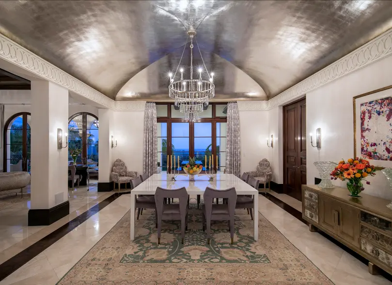 Στον χώρο του μπαρ, τα πολυτελή σκαμπό τοποθετούνται σε ένα τραπέζι ανάμεσα σε δύο τοξωτές κολώνες, ενώ ράφια γεμάτα ποτήρια εκτείνονται από το δάπεδο μέχρι την οροφή. «Οι ευέλικτοι χώροι, τόσο μέσα όσο και έξω, δημιουργούν ένα ιδανικό σπίτι για 2 άτομα, αλλά μπορεί εύκολα να φιλοξενήσει πάνω από 200 άτομα», σημειώνεται περαιτέρω στην αγγελία της μεσιτικής εταιρείας.