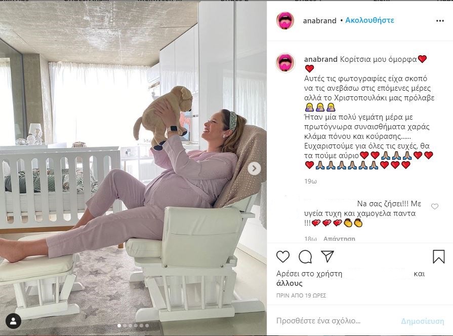 Όπως έγραψε συγκεκριμένα: “Αυτές τις φωτογραφίες είχα σκοπό να τις ανεβάσω στις επόμενες μέρες αλλά το Χριστοπουλάκι μας πρόλαβε. Ήταν μία πολύ γεμάτη μέρα με πρωτόγνωρα συναισθήματα χαράς κλάμα πόνου και κούρασης… Ευχαριστούμε για όλες τις ευχές, θα τα πούμε αύριο”