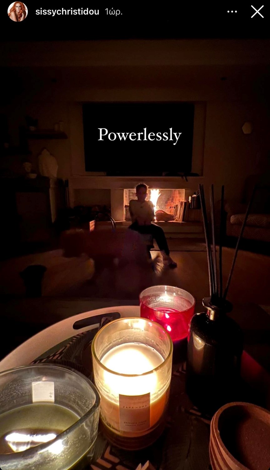 Όσον αφορά στο Instagram, η Σίσσυ Χρηστίδου ανέβασε δύο φωτογραφίες από το εσωτερικό του σπιτιού της, στις οποίες φαίνεται ότι έχει ανάψει το τζάκι για ζεστασιά, αλλά και κάποια κεράκια για φωτισμό.
