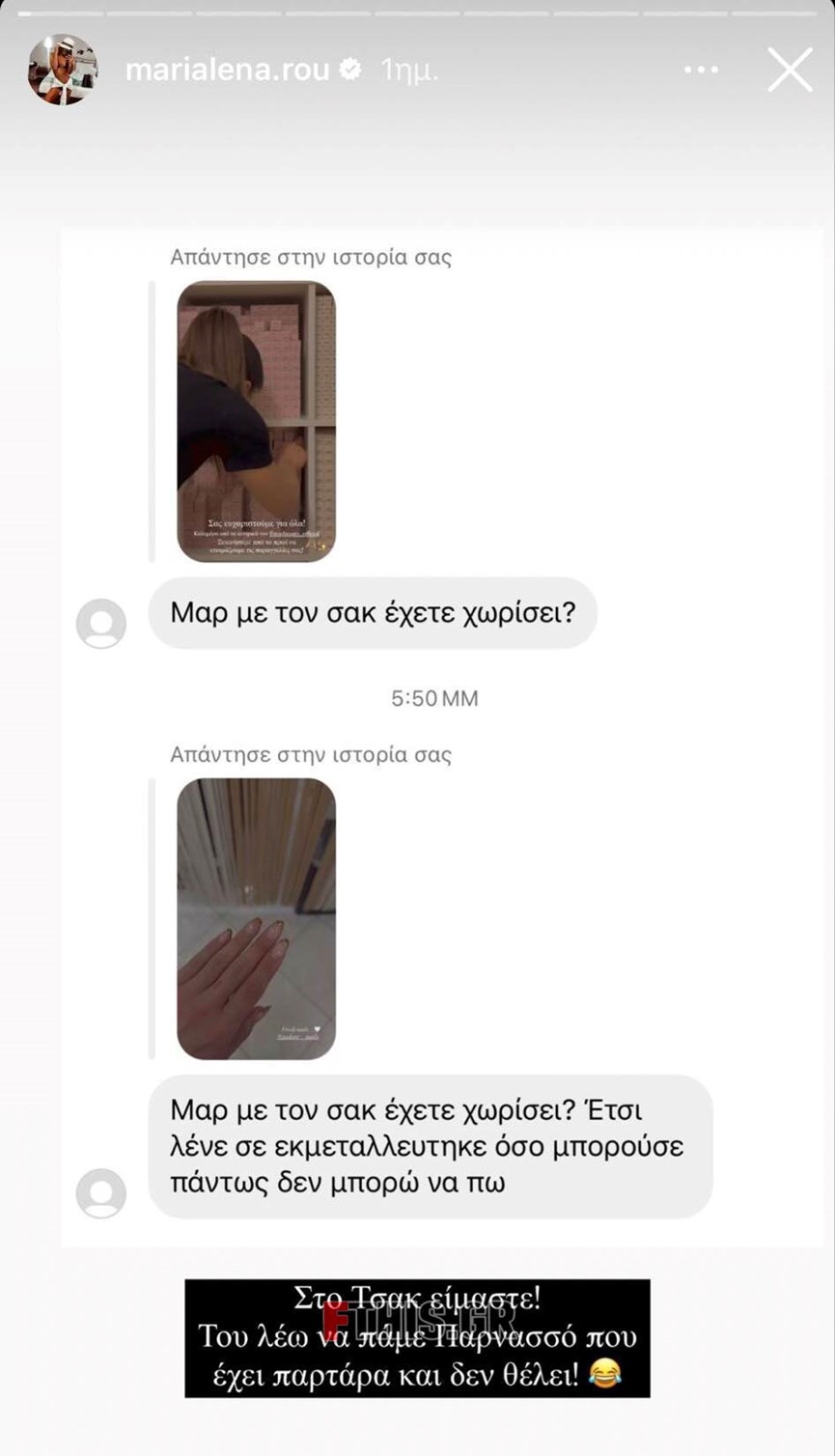«Μαριαλένα με τον Σάκη έχετε χωρίσει; Έτσι λένε. Σε εκμεταλλεύτηκε όσο μπορούσε πάντως δεν μπορώ να πω», έγραφε το μήνυμα που δέχθηκε η Μαριαλένα Ρουμελιώτη, το οποίο η ίδια κοινοποίησε και δεν δίστασε να απαντήσει δημόσια.