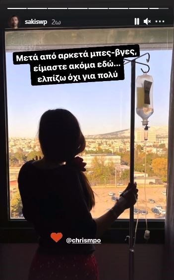 Ο Σάκης Τανιμανίδης έκανε ένα story στον λογαριασμό του στο Instagram. Δημοσίευσε μία φωτογραφία στην οποία η Χριστίνα Μπόμπα φαίνεται να έχει στο χέρι της ορό. “Μετά από αρκετά μπες – βγες, είμαστε ακόμα εδώ… ελπίζω όχι για πολύ”, έγραψε ο παρουσιαστής.