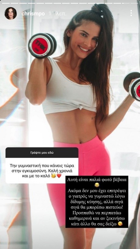 «Ακόμα δε μου έχει επιτρέψει ο γιατρός να γυμναστώ λόγω δίδυμης κύησης, αλλά σιγά σιγά θα μπορέσω πιστεύω! Προσπαθώ να περπατάω καθημερινά και αν ξεκινήσω κάτι άλλο θα σας δείξω», ανέφερε η Χριστίνα Μπόμπα.