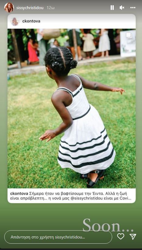 «Σήμερα ήταν να βαφτίσουμε την Έιντα. Αλλά η ζωή είναι απρόβλεπτη… η νονά μας Σίσσυ Χρηστίδου είναι με Covid αλλά οι φίλοι μας έχουν έρθει… Και γιορτάσαμε την Έιντα. Αλλά η βάφτιση αναβλήθηκε. Γιατί ο ρόλος της νονάς είναι ιερός και η Έιντα φωνάζει “νονά” την Σίσσυ απο τότε που φωνάζει “μαμά” εμένα. Κι αυτό δεν θα αλλάξει. Σήμερα μας ευλόγησε ο παπά Γιάννης και μας διάβασε τον ύμνο της Αγάπης και μετά την γιορτάσαμε… Σύντομα θα γιορτάσουμε και την βάφτιση! Σας ευχαριστώ όλους! Σίσσυ Χρηστίδου σε αγαπάμε και μας λείπεις», έγραψε χαρακτηριστικά η Χριστίνα Κοντοβά στο Instagram.