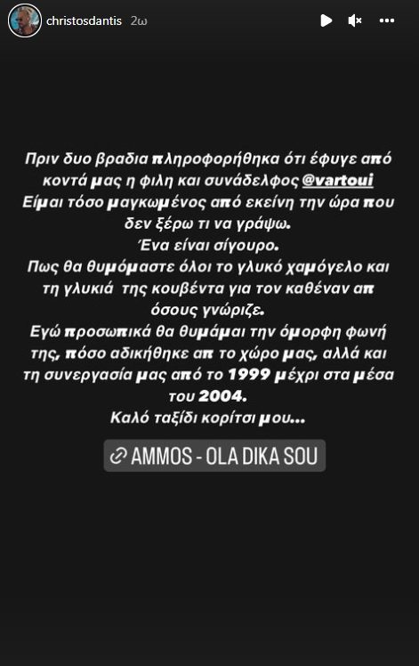 Όπως γνωστοποίησε ο ίδιος ο τραγουδιστής μέσα από τον λογαριασμό του στο Instagram, πέθανε μια καλή του φίλη και συνάδελφος. Ο Χρήστος Δάντης την αποχαιρέτησε με μια συγκινητική ανάρτηση, αναφέροντας πως θα θυμάται την όμορφη φωνή της, το γεγονός ότι αδικήθηκε από τον χώρο και τη συνεργασία τους στο παρελθόν.