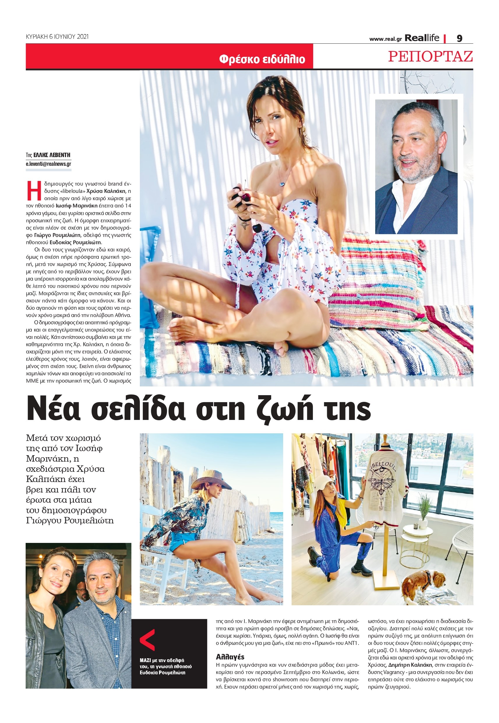 Η δημιουργός του γνωστού brand ένδυσης «libeloula» Χρύσα Καλπάκη, η οποία πριν από λίγο καιρό χώρισε με τον ηθοποιό Ιωσήφ Μαρινάκη έπειτα από 14 χρόνια γάμου, έχει γυρίσει οριστικά σελίδα στην προσωπική της ζωή. Η όμορφη επιχειρηματίας είναι πλέον σε σχέση με τον δημοσιογράφο Γιώργο Ρουμελιώτη, αδελφό της γνωστής ηθοποιού Ευδοκίας Ρουμελιώτη. Οι δυο τους γνωρίζονταν εδώ και καιρό, όμως η σχέση πήρε πρόσφατα ερωτική τροπή, μετά τον χωρισμό της Χρύσας. Σύμφωνα με πηγές από το περιβάλλον τους, έχουν βρει μια υπέροχη ισορροπία και απολαμβάνουν κάθε λεπτό του ποιοτικού χρόνου που περνούν μαζί. Μοιράζονται τις ίδιες ανησυχίες και βρίσκουν πάντα κάτι όμορφο να κάνουν. Και οι δύο αγαπούν τη φύση και τους αρέσει να περνούν χρόνο μακριά από την πολύβουη Αθήνα. Ο δημοσιογράφος έχει απαιτητικό πρόγραμμα και οι επαγγελματικές υποχρεώσεις του είναι πολλές. Κάτι αντίστοιχο συμβαίνει και με την καθημερινότητα της Χρ. Καλπάκη, η όποια διαχειρίζεται μόνη της την εταιρεία. Ο ελάχιστος ελεύθερος χρόνος τους, λοιπόν, είναι αφιερωμένος στη σχέση τους. Εκείνη είναι άνθρωπος χαμηλών τόνων και αποφεύγει να απασχολεί τα ΜΜΕ με την προσωπική της ζωή. Ο χωρισμός της από τον Ιωσήφ Μαρινάκη την έφερε αντιμέτωπη με τη δημοσιότητα και για πρώτη φορά προέβη σε δημόσιες δηλώσεις. «Ναι, έχουμε χωρίσει. Υπάρχει, όμως, πολλή αγάπη. Ο Ιωσήφ θα είναι ο άνθρωπός μου για μια ζωή», είχε πει στο «Πρωινό» του ΑΝΤ1.