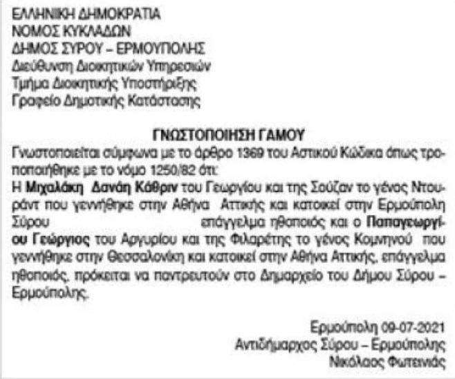 “Η Μιχαλάκη Δανάη Κάθριν του Γεωργίου και της Σούζαν το γένος Ντουράντ που γεννήθηκε στην Αθήνα της Αττικής και κατοικεί στην Ερμούπολη Σύρου στην οδό Επιδαύρου 5, επάγγελμα ηθοποιός, και ο Παπαγεωργίου Γεώργιος του Αργυρίου και της Φιλαρέτης το γένος Κομνηνού, που γεννήθηκε στην Θεσσαλονίκη και κατοικεί στην Αθήνα Αττικής, επάγγελμα ηθοποιός, πρόκειται να παντρευτούν στο δημαρχείο Σύρου Ερμούπολης” αναφέρει η αναγγελία στην “Κοινή Γνώμη”.