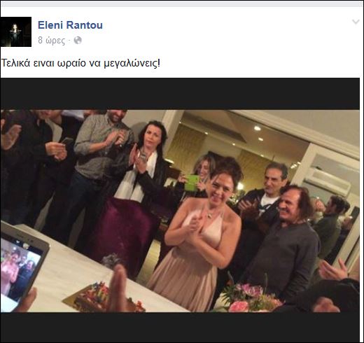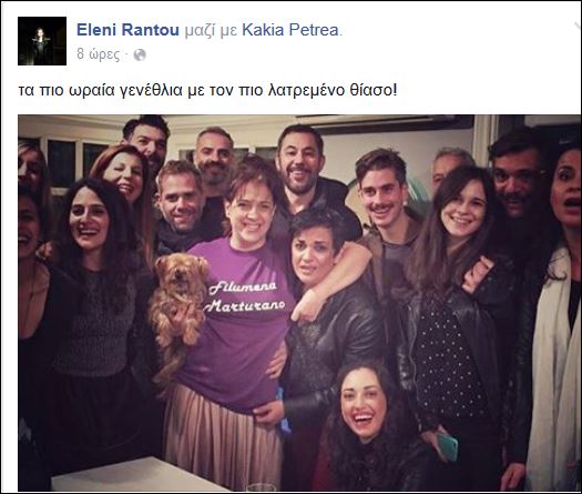Τα γενέθλια της γιόρτασε την Πέμπτη η Ελένη Ράντου μαζί με τον σύζυγο της Βασίλη Παπακωνσταντίνου και τους συντελεστές της θεατρικής παράστασης «Φιλουμένα», στην οποία πρωταγωνιστεί στο Εθνικό Θέατρο. Η δημοφιλής ηθοποιός ανέβασε στην προσωπική της σελίδα στο Facebook δύο φωτογραφίες από τον εορτασμό των γενεθλίων της με τα ακόλουθα σχόλια: «Τα πιο ωραία γενέθλια με τον πιο λατρεμένο θίασο» και «Τελικά είναι ωραίο να μεγαλώνεις».
