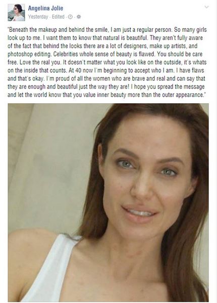 Μία selfie φωτογραφία, χωρίς ίχνος μακιγιάζ, ανέβασε η σταρ του Χόλιγουντ, Αντζελίνα Τζολί στο Facebook.