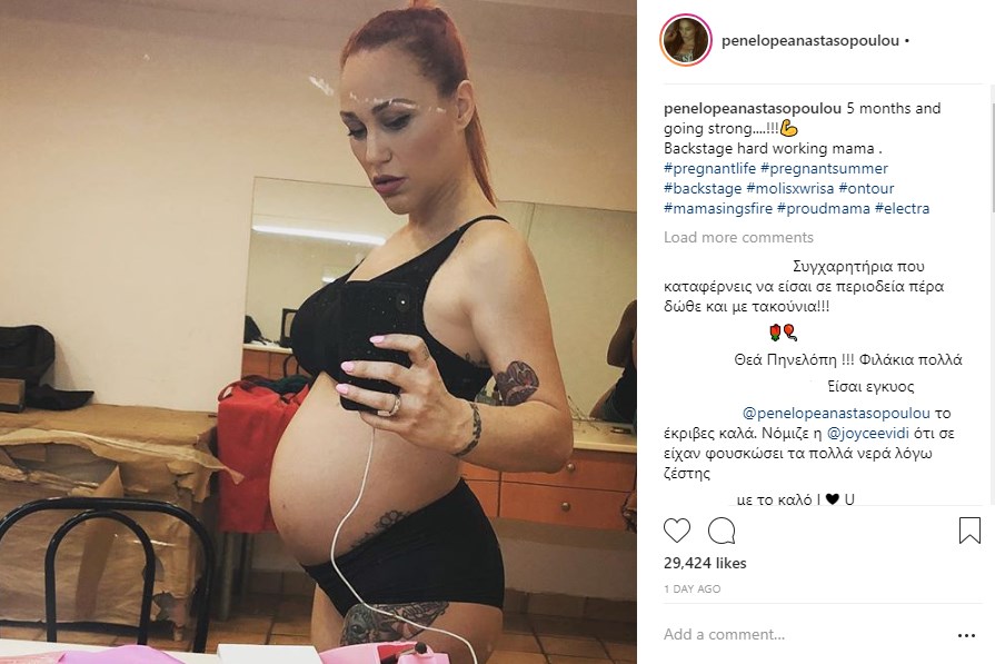 Η Πηνελόπη Αναστασοπούλου ανέβασε στον προσωπικό της λογαριασμό στο instagram μία φωτογραφία από τη φουσκωμένη της κοιλίτσα. Η γνωστή ηθοποιός διανύει τον 5ο μήνα της εγκυμοσύνης της.