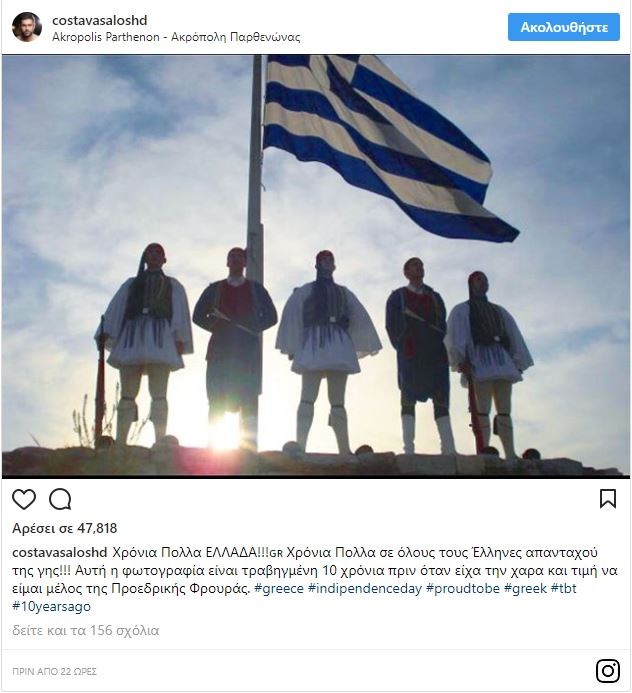 «Χρόνια Πολλά ΕΛΛΑΔΑ!!! Χρόνια Πολλά σε όλους τους Έλληνες απανταχού της γης!!! Αυτή η φωτογραφία είναι τραβηγμένη 10 χρόνια πριν όταν είχα την χαρά και τιμή να είμαι μέλος της Προεδρικής Φρουράς!», έγραψε ο πρώην παίκτης του Survivor, δίπλα από τη φωτογραφία στην οποία τον βλέπουμε να ποζάρει με άλλους Εύζωνες, στην Ακρόπολη, κάτω από την ελληνική σημαία.
