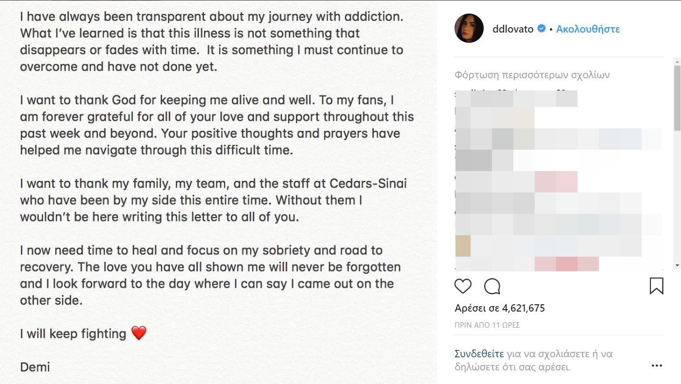 Η ηθοποιός και τραγουδίστρια Demi Lovato δηλώνει ευγνώμων που ζει έπειτα από μια υπερβολική δόση ναρκωτικών ουσιών που την έστειλε στο νοσοκομείο πριν από δύο εβδομάδες, και τονίζει ότι χρειάζεται χρόνο για να θεραπευτεί από τον εθισμό της, σε μήνυμα που ανάρτησε στο Instagram την Κυριακή.