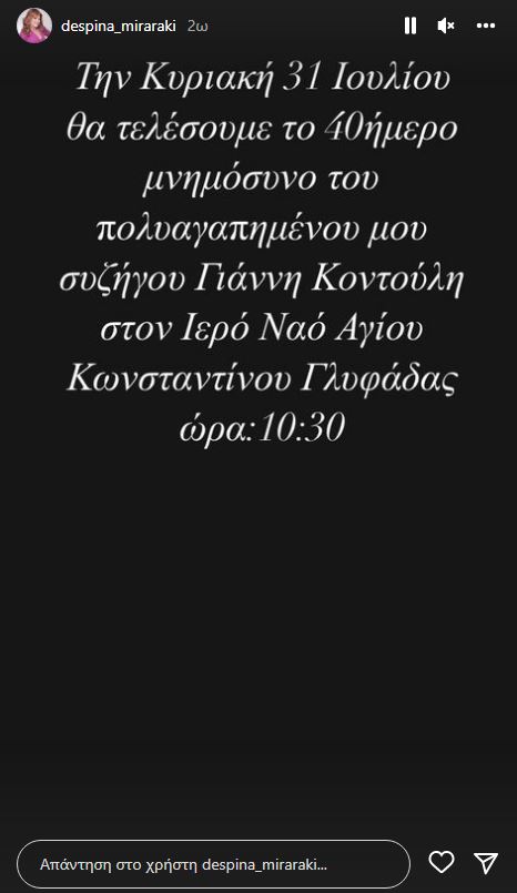 «Την Κυριακή 31 Ιουλίου θα τελέσουμε το 40ημερο μνημόσυνο του πολυαγαπημένου μου συζύγου Γιάννη Κοντούλη στον Ιερό Ναό Αγίου Κωνσταντίνου Γλυφάδας, ώρα 10:30», έγραψε η Δέσποινα Μοιραράκη.