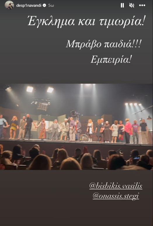 Η τραγουδίστρια δημοσίευσε και μία φωτογραφία με τον Βασίλη Μπισμπίκη, την ώρα που επιστρέφουν σπίτι μετά το τέλος της παράστασης. «Η πιο ωραία στιγμή. Την ώρα που γυρνάς σπίτι μετά από μια τόσο καλή πρεμιέρα», έγραψε η Δέσποινα Βανδή.