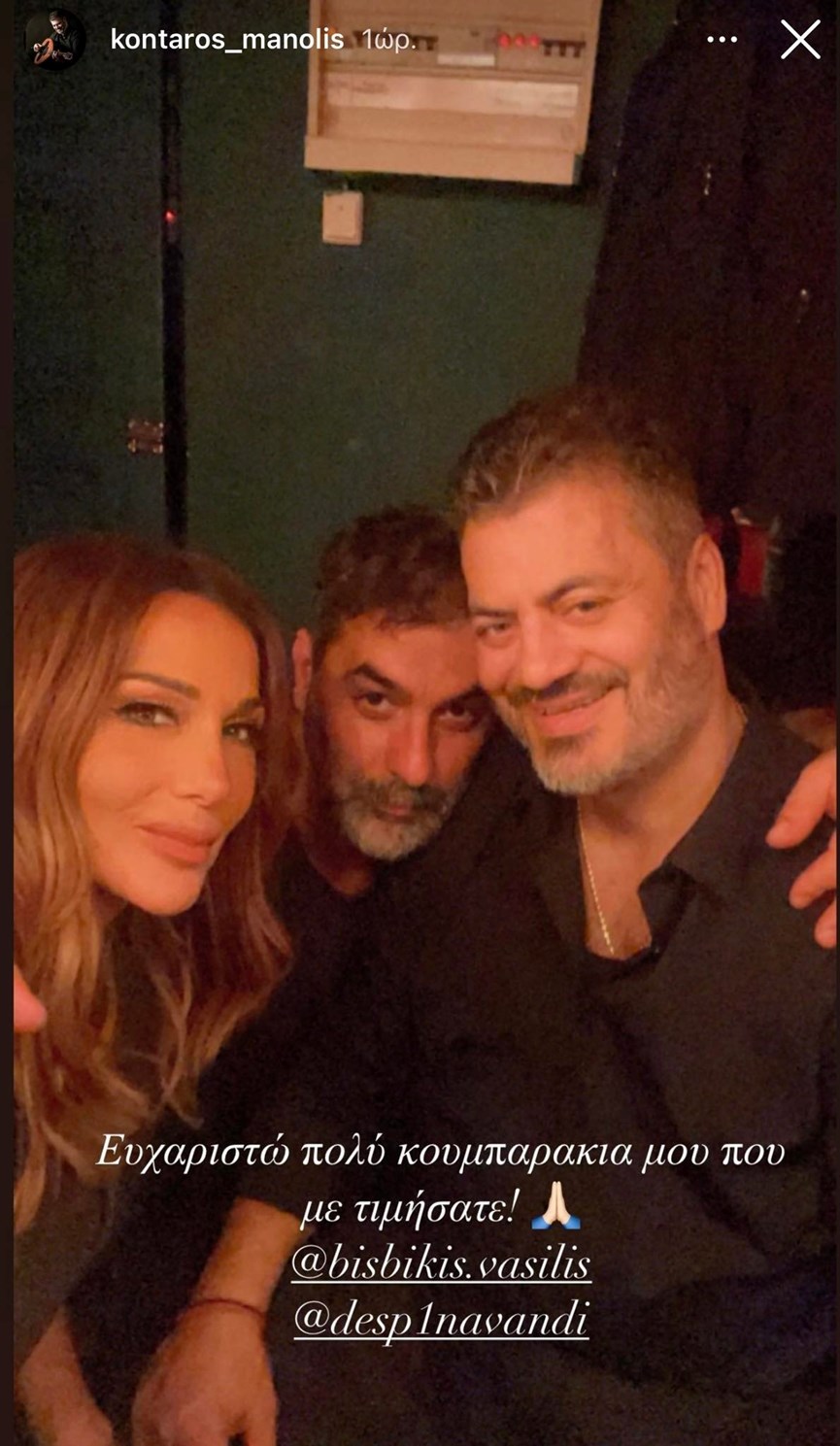 Ο Μανώλης Κονταρός, στο τέλος της βραδιάς, ανέβασε μια φωτογραφία στην οποία ποζάρει με το ζευγάρι και έγραψε: “Ευχαριστώ πολύ κουμπαράκια μου που με τιμήσατε”.