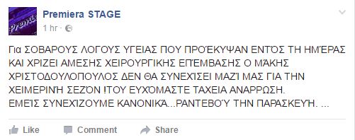 “Για σοβαρούς λόγους υγείας που προέκυψαν εντός της ημέρας και χρήζει άμεσης χειρουργικής επέμβασης ο Μάκης Χριστοδουλόπουλος δεν θα συνεχίσει μαζί μας για την χειμερινή σεζόν. Του ευχόμαστε ταχεία ανάρρωση. Εμείς συνεχίζουμε κανονικά… Ραντεβού την Παρασκευή…” αναφέρει στη σελίδα του το νυχτερινό κέντρο.