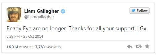 Ενώ οι οπαδοί των Beady Eye περίμεναν με αγωνία την τρίτη δισκογραφική τους δουλειά, ο ίδιος ο Liam Gallagher αποκάλυψε μέσω Twitter ότι η μπάντα σταμάτησε να υπάρχει από το Σάββατο.
