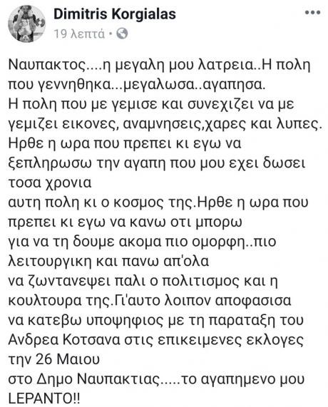 “Ναύπακτος….η μεγάλη μου λατρεία..Η πόλη που γεννήθηκα…μεγάλωσα..αγάπησα. Η πόλη που με γέμισε και συνεχίζει να με γεμίζει εικόνες, αναμνήσεις,χαρές και λύπες. Ήρθε η ώρα που πρέπει κι εγώ να ξεπληρώσω την αγάπη που μου έχει δώσει τόσα χρόνια αυτή πόλη κι ο κόσμος της. Ήρθε η ώρα που πρέπει κι εγώ να κάνω ότι μπορώ για να τη δούμε ακάμα πιο όμορφη..πιο λειτουργική και πάνω απ’όλα να ζωντανέψει πάλι ο πολιτισμός και η κουλτούρα της.Γι’αυτό λοιπόν αποφάσισα να κατεβώ υποψήφιος με την παράταξη του Ανδρέα Κοτσανά στις επικείμενες εκλογές της 26ης Μαΐου στο Δήμο Ναυπακτίας…..το αγαπημένο μου LEPANTO!!” αναφέρει στην ανάρτησή του.