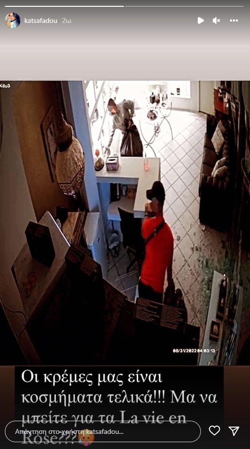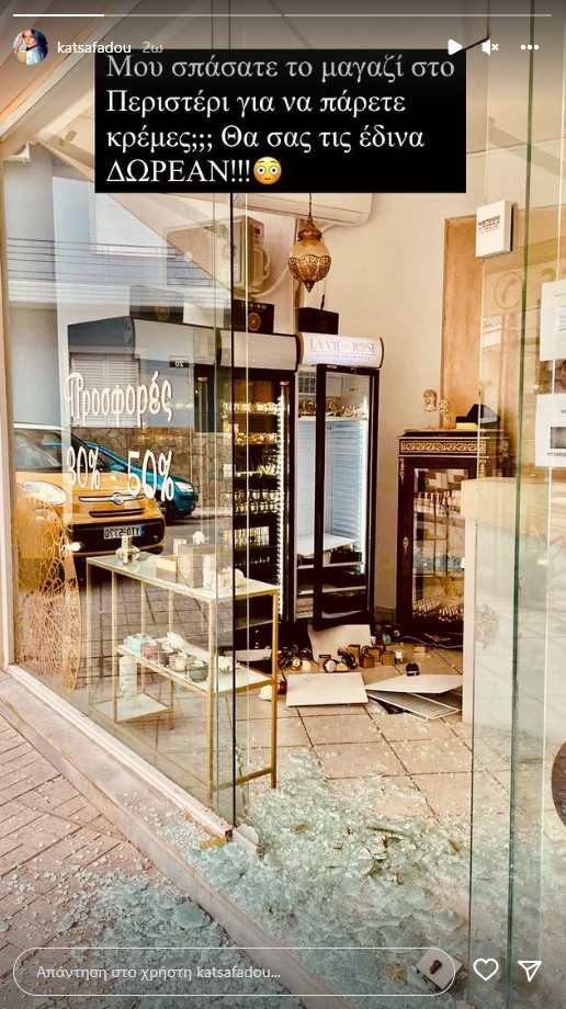 Την είδηση έκανε γνωστή η ίδια η επιχειρηματίας με αναρτήσεις της στο προφίλ της στο Instagram, στις οποίες αναφέρει πως οι δράστες εισήλθαν στο μαγαζί και απέσπασαν κρέμες.