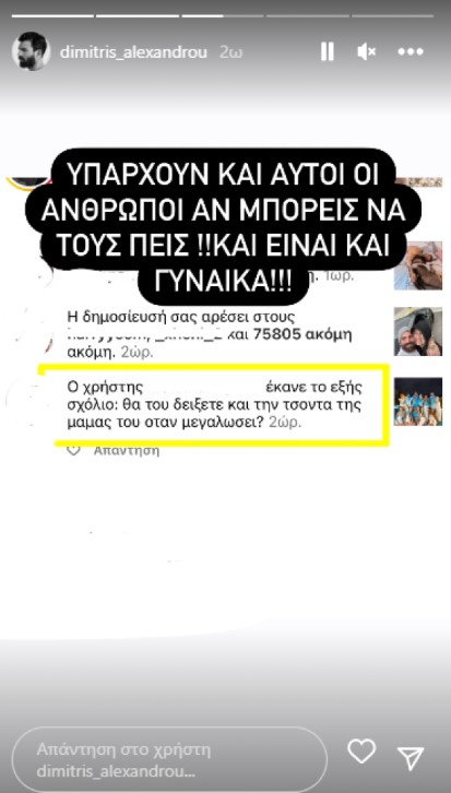Ένα προσβλητικό σχόλιο που έκανε γυναίκα χρήστης σε πρόσφατη ανάρτηση του στο Instagram, το οποίο τον ενόχλησε, μοιράστηκε με τους διαδικτυακούς του φίλους ο Δημήτρης Αλεξάνδρου.