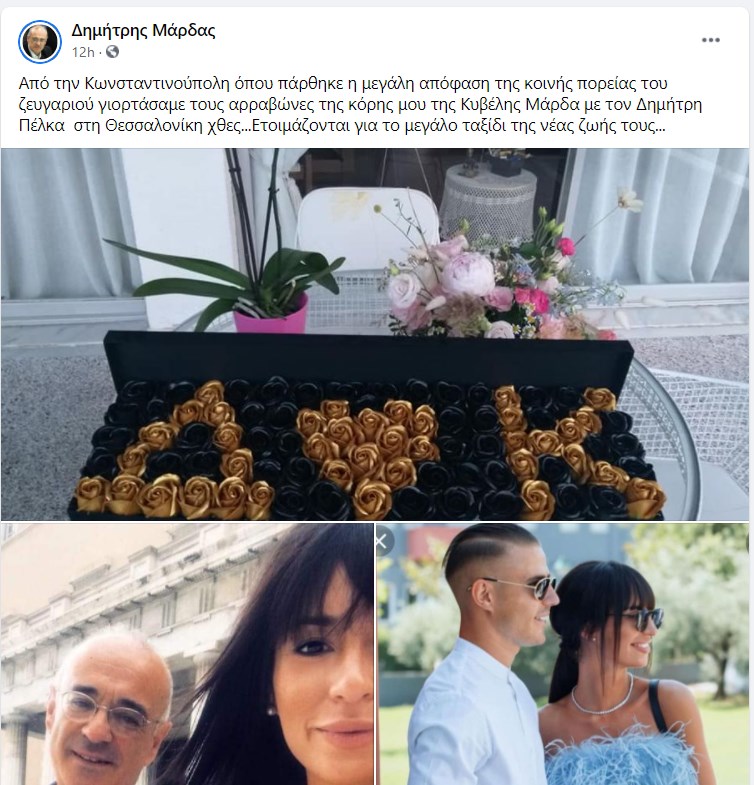 “Από την Κωνσταντινούπολη όπου πάρθηκε η μεγάλη απόφαση της κοινής πορείας του ζευγαριού γιορτάσαμε τους αρραβώνες της κόρης μου της Κυβέλης Μάρδα με τον Δημήτρη Πέλκα στη Θεσσαλονίκη χθες… Ετοιμάζονται για το μεγάλο ταξίδι της νέας ζωής τους…” έγραψε χαρακτηριστικά στον λογαριασμό του στο Facebook ο Δημήτρης Μάρδας.