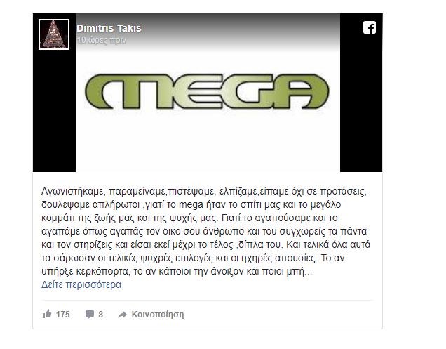 Με ανάρτησή του στον προσωπικό λογαριασμό του στο Facebook, ο δημοσιογράφος του Mega Δημήτρης Τάκης αναφέρθηκε στις δραματικές εξελίξεις για το κανάλι και στον αγώνα των εργαζομένων.«Αγωνιστήκαμε, παραμείναμε, πιστέψαμε, ελπίζαμε, είπαμε όχι σε προτάσεις, δουλέψαμε απλήρωτοι, γιατί το mega ήταν το σπίτι μας και το μεγάλο κομμάτι της ζωής μας και της ψυχής μας. Γιατί το αγαπούσαμε και το αγαπάμε όπως αγαπάς τον δικό σου άνθρωπο και του συγχωρείς τα πάντα και τον στηρίζεις και είσαι εκεί μέχρι το τέλος, δίπλα του», αναφέρει ο Δημήτρης Τάκης και προσθέτει:«Και τελικά όλα αυτά τα σάρωσαν οι τελικές ψυχρές επιλογές και οι ηχηρές απουσίες. Το αν υπήρξε κερκόπορτα, το αν κάποιοι την άνοιξαν και ποιοι μπήκαν για τη διαδικασία της άλωσης θα είναι το ερώτημα που ο καθένας θα πάρει μαζί του όταν τα φώτα θα κλείσουν οριστικά και θα φύγουμε κλείνοντας για πάντα την πόρτα του mega».«Θα μείνουμε μέχρι τέλους εκεί για να του κλείσουμε τα μάτια και ας μην φταίμε για τον θανατο του, όπως κλείνεις τα μάτια στο δικό σου άνθρωπο την ώρα που φεύγει και του λες για τελευταία φορά πόσο τον αγαπούσες».Δείτε την ανάρτηση του δημοσιογράφου: