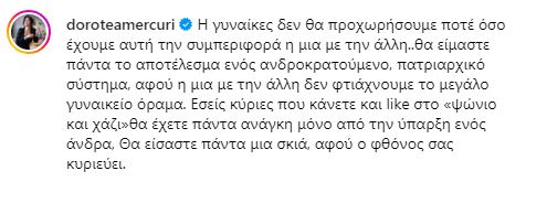 Συγκεκριμένα δημοσίευσε το μήνυμα της γυναίκας και έγραψε στην λεζάντα: «Οι γυναίκες δεν θα προχωρήσουμε ποτέ όσο έχουμε αυτή την συμπεριφορά η μια με την άλλη… θα είμαστε πάντα το αποτέλεσμα ενός ανδροκρατούμενου, πατριαρχικού συστήματος, αφού η μια με την άλλη δεν φτιάχνουμε το μεγάλο γυναικείο όραμα. Εσείς κύριες που κάνετε και like στο «ψώνιο και χαζή» θα έχετε πάντα ανάγκη μόνο από την ύπαρξη ενός άνδρα, Θα είσαστε πάντα μια σκιά, αφού ο φθόνος σας κυριεύει».
