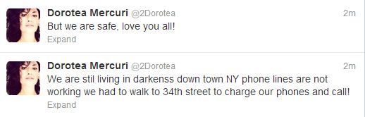 Η ίδια αναφέρει στο μήνυμα της: «Ζούμε ακόμα στο σκοτάδι στο κέντρο της Νέας Υόρκης, οι τηλεφωνικές γραμμές δεν λειτουργούν και έπρεπε να περπατήσουμε ως την 34η οδό για να φορτίσουμε τα τηλέφωνα μας.»