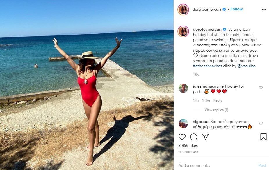 Με ένα κόκκινο ολόσωμο μαγιό που αναδεικνύει τις τέλειες αναλογίες της, η Δωροθέα Μερκούρη άναψε φωτιές στο Instagram. Όπως έγραψε, στα ιταλικά αλλά και στα ελληνικά, αν και δεν έχει φύγει από την πόλη βρίσκει τρόπους να απολαμβάνει τη θάλασσα και να δροσίζεται εν μέσω καύσωνα. «Είμαστε ακόμα διακοπές στην πόλη αλλά βρίσκω έναν παράδεισο να κάνω το μπάνιο μου» έγραψε στη λεζάντα.