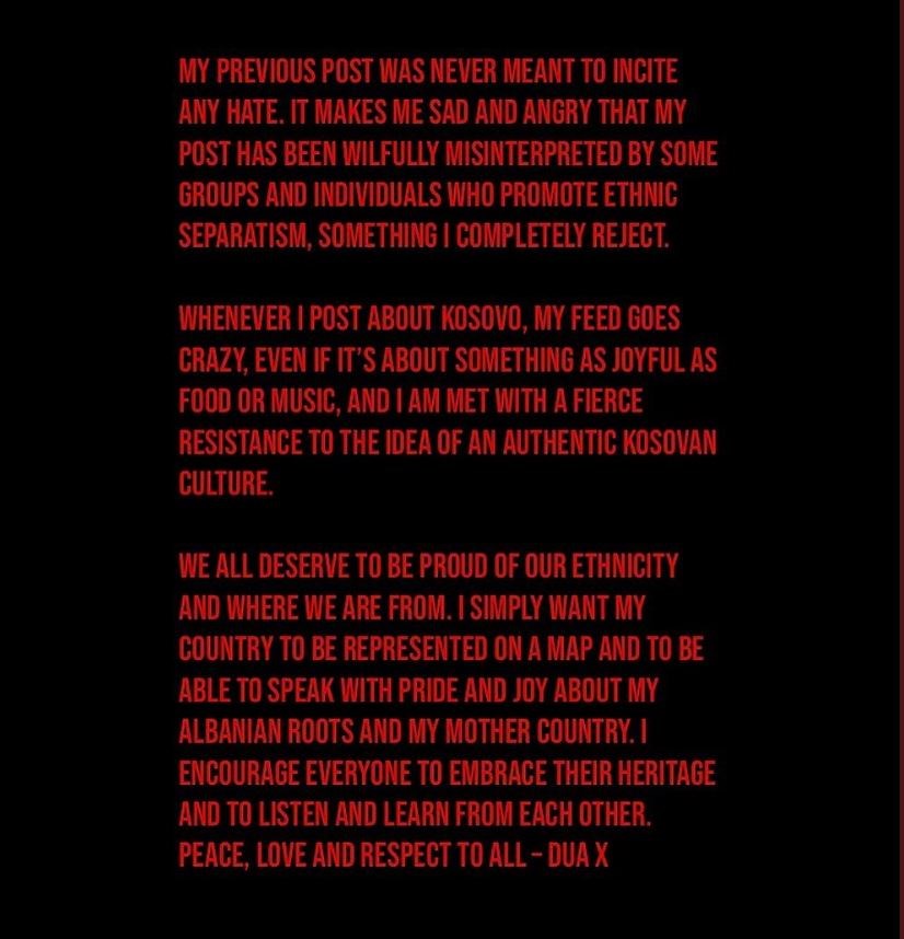 Όπως αναφέρει χαρακτηριστικά: “με την προηγούμενη ανάρτησή μου δεν είχα ποτέ σκοπό να προκαλέσω μίσος. Με κάνει να λυπάμαι και να θυμώνω το ότι παρερμηνεύτηκε σκόπιμα από ορισμένες ομάδες και άτομα που προωθούν τον εθνικιστικό αυτονομισμό, κάτι που απορρίπτω εντελώς”. Σημειώνει ακόμη: “Κάθε φορά που δημοσιεύω κάτι για το Κοσσυφοπέδιο, η ροή στο προφίλ μου… τρελαίνεται, ακόμα κι αν πρόκειται για κάτι χαρούμενο, όπως το φαγητό ή η μουσική και αντιμετωπίζω έντονη αντίσταση στην ιδέα ενός αυθεντικού πολιτισμού του Κοσόβου. Όλοι αξίζουμε να είμαστε περήφανοι για την εθνικότητά μας. Θέλω απλώς να εκπροσωπηθεί η χώρα μου σε έναν χάρτη και να μπορώ να μιλάω με υπερηφάνεια και χαρά για τις αλβανικές ρίζες μου και τη μητέρα μου χώρα. Ενθαρρύνω όλους να αγκαλιάσουν την κληρονομιά τους και να ακούσουν και να μάθουν ο ένας από τον άλλο. Ειρήνη, αγάπη και σεβασμός σε όλους».