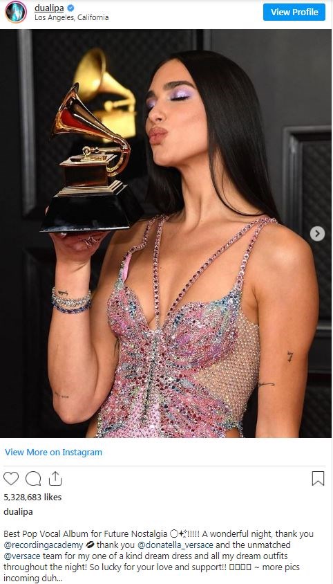 Δεν αποτελεί έκπληξη το γεγονός ότι ο Versace «επιστράτευσε» τη Lipa, καθώς η ίδια η επικεφαλής του οίκου, Donatella συχνά επιμελείται τις εμφανίσεις της τραγουδίστριας στο κόκκινο χαλί τελετών απονομής βραβείων. Πιο πρόσφατα, η Dua Lipa παρακολούθησε την 63η τελετή απονομής των Grammy, φορώντας ένα φόρεμα με αλυσίδα με την υπογραφή του οίκου.